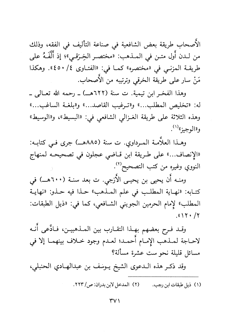 ومنه أَن يحيى بن يحيى الأَزجي ت بعد سنة (٦٠٠ هـ) في كتابه: " نهاية المطلب في علم المذهب " حذا فيه حذو " نهاية المطلب " لِإمام الحرمين الجويني الشافعي، كما في: " ذيل الطبقات " وقد فرح بعضهم بهذا التقارب بين المذهبين، فادَّعى أَنه لا حاجة لمذهب الإمام أَحمد؛ لعدم وجود خلاف بينهما إلا في مسائل قليلة نحو ست عشرة مسألة؟