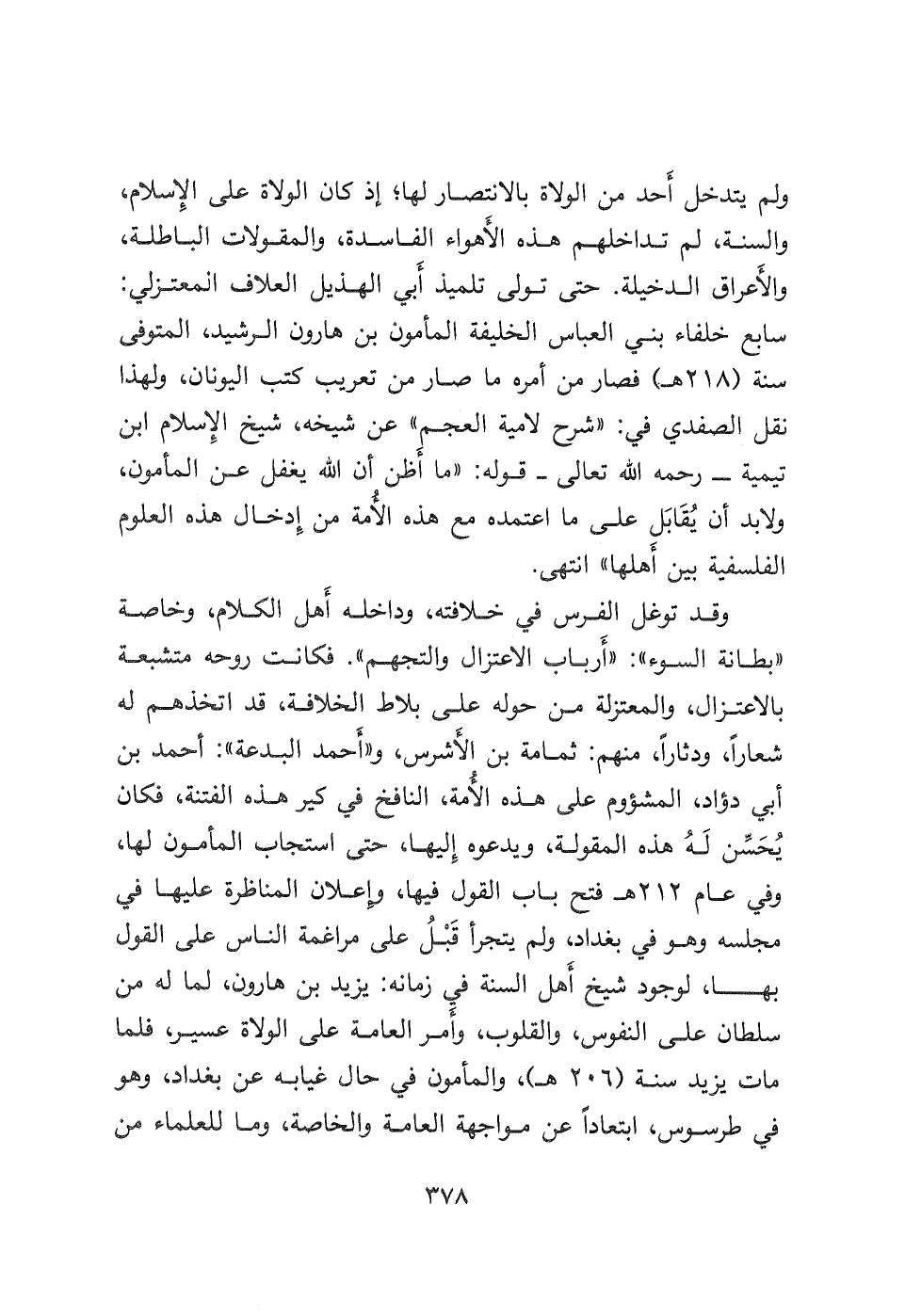 ولم يتدخل أَحد من الولاة بالانتصار لها؛ إذ كان الولاة على الإسلام، والسنة، لم تداخلهم هذه الأَهواء الفاسدة، والمقولات الباطلة، والأعراق الدخيلة. حتى تولى تلميذ أَبي الهذيل العلاف المعتزلي: سابع خلفاء بني العباس الخليفة المأمون بن هارون الرشيد، المتوفى سنة (٢١٨ هـ) فصار من أمره ما صار من تعريب كتب اليونان، ولهذا نقل الصفدي في: " شرح لامية العجم " عن شيخه، شيخ الإسلام ابن تيمية- رحمه الله تعالى- قوله: " ما أظن أن الله يغفل عن المأمون، ولابد أن يُقَابَل على ما اعتمده مع هذه الأمة من إِدخال هذه العلوم الفلسفية بين أَهلها " انتهى.
