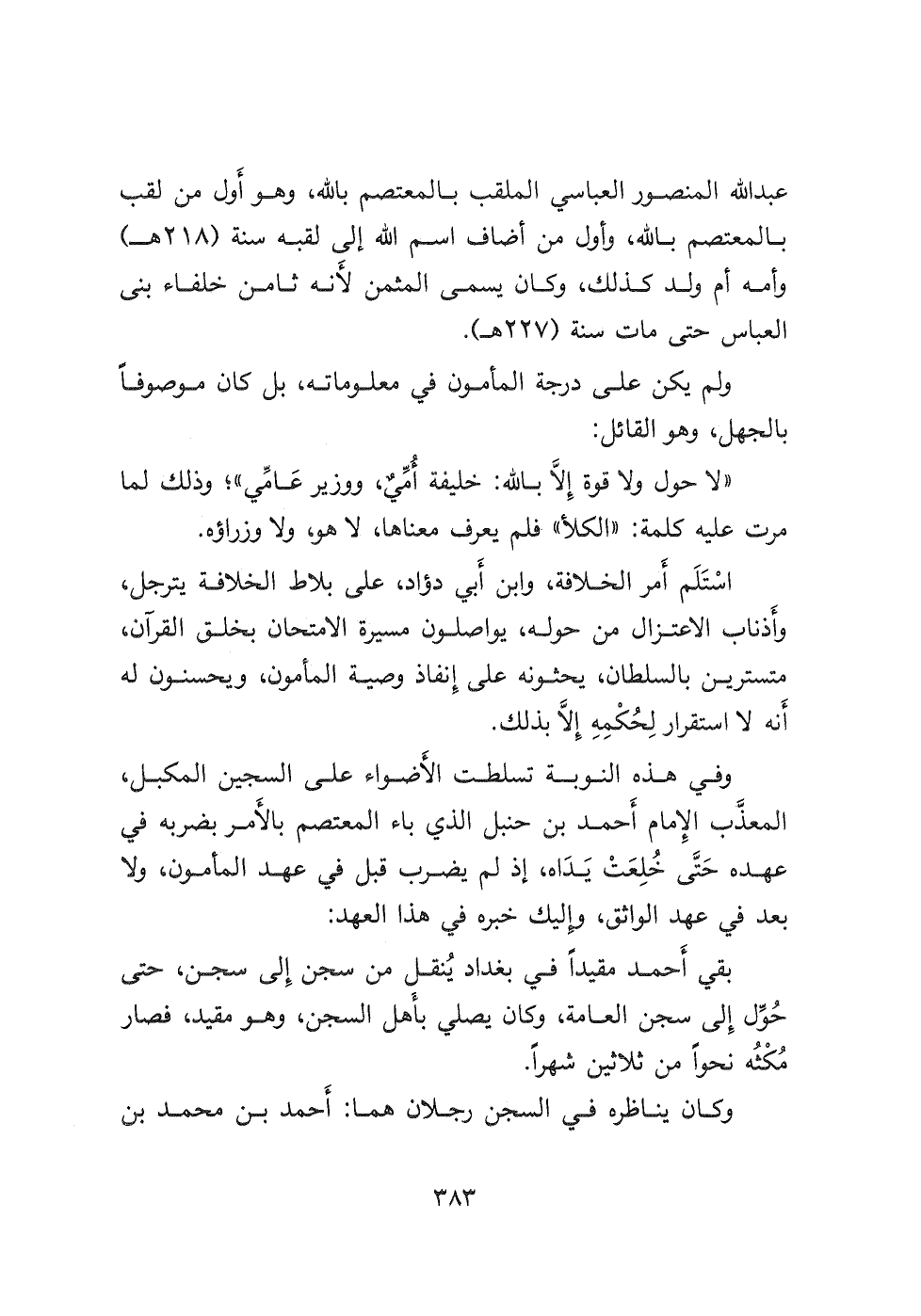 وفي هذه النوبة تسلطت الأَضواء على السجين المكبل، المعذَّب الإمام أَحمد بن حنبل الذي باء المعتصم بالأَمر بضربه في عهده حَتَّى خُلِعَتْ يَدَاه، إذ لم يضرب قبل في عهد المأمون، ولا بعد في عهد الواثق، وإليك خبره في هذا العهد: