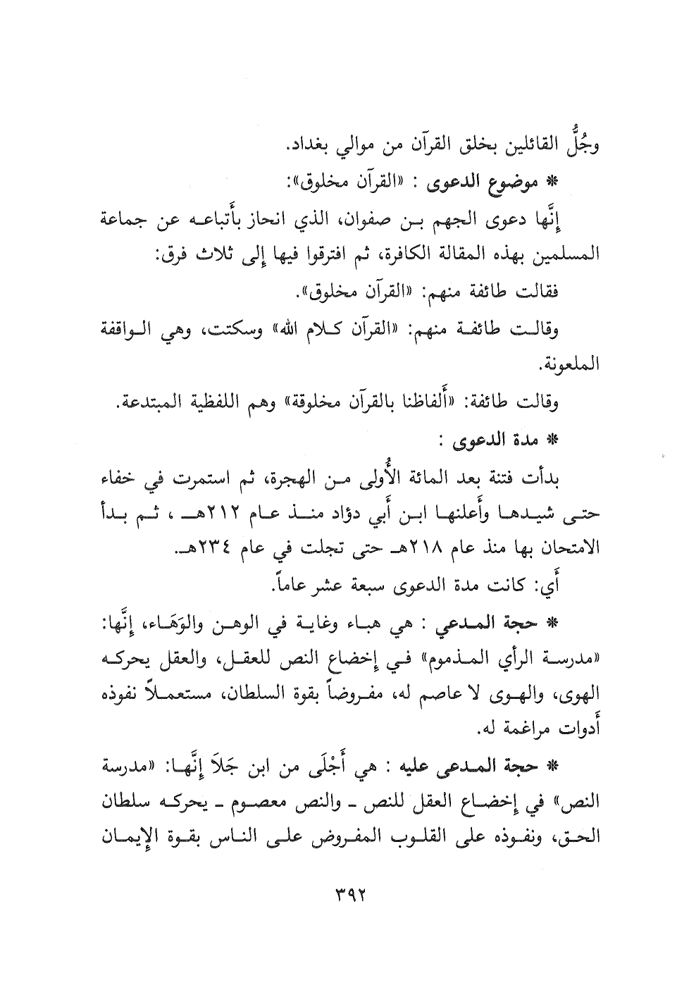 * حجة المدعي: " هي هباء وغاية في الوهن والوَهَاء، إِنَّها: " مدرسة الرأي المذموم " في إِخضاع النص للعقل، والعقل يحركه الهوى، والهوى لا عاصم له، مفروضًا بقوة السلطان، مستعملًا نفوذه أَدوات مراغمة له.