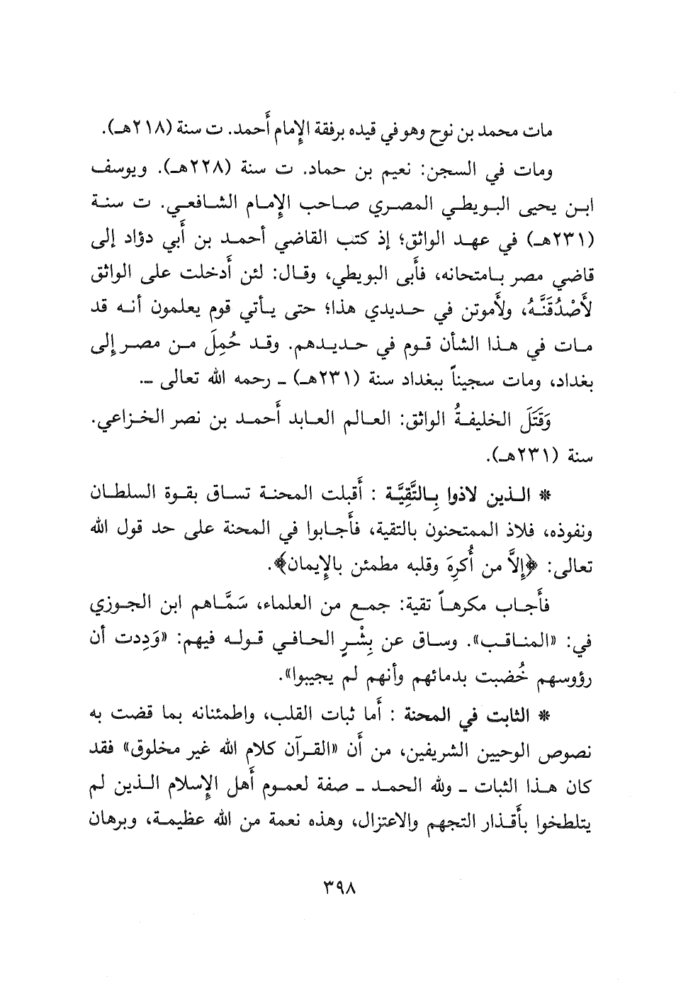 * الذين لاذوا بِالتَّقِيَّة: أَقبلت المحنة تساق بقوة السلطان ونفوذه، فلاذ الممتحنون بالتقية، فأَجابوا في المحنة على حد قول الله تعالى: (إِلَّا مَنْ أُكْرِهَ وَقَلْبُهُ مُطْمَئِنٌّ بِالْإِيمَانِ) .