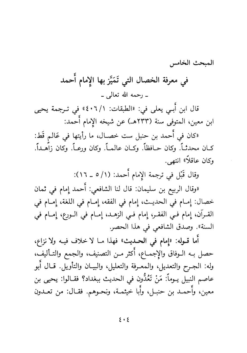 المبحث الخامس: في معرفة الخصال التي تَمَيَّز بها الإمام أَحمد - رحمه الله تعالى-