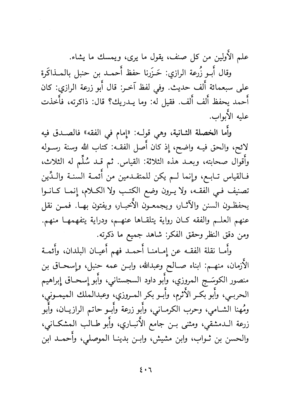 وأَما نقلة الفقه عن إمامنا أَحمد فهم أَعيان البلدان، وأَئمة الأَزمان، منهم: ابناه صالح وعبد الله، وابن عمه حنبل، وإسحاق بن منصور الكوسَج المروزي، وأَبو داود السجستاني، وأَبو إِسحاق إبراهيم الحربي، وأَبو بكر الأَثرم، وأَبو بكر المروزي، وعبد الملك الميموني، ومُهنا الشامي، وحرب الكرماني، وأَبو زرعة وأَبو حاتم الرازيان، وأَبو زرعة الدمشقي، ومثنى بن جامع الأنباري، وأبو طالب المشكاني، والحسن بن ثواب، وابن مشيش، وابن بدينا الموصلي، وأَحمد ابن