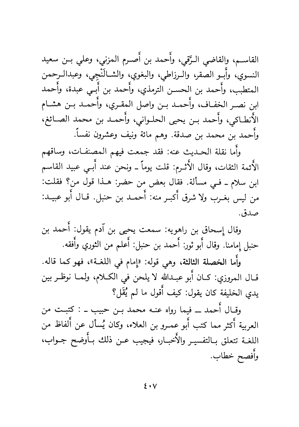 وأَما نقلة الحديث عنه: فقد جمعت فيهم المصنفات، وساقهم الأئمة الثقات، وقال الأَثرم: قلت يوما - ونحن عند أَبي عبيد القاسم ابن سلام - في مسألة. فقال بعض من حضر هذا قول من؟ فقلت: من ليس بغرب ولا شرق أكبر منه: أَحمد بن حنبل. قال أَبو عبيد: صدق.