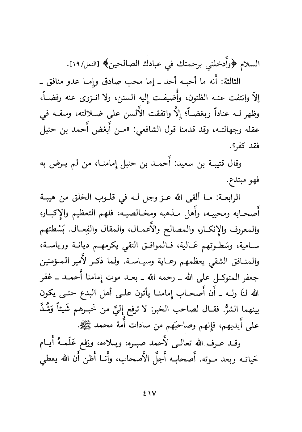 الثالثة: أَنه ما أحبه أحد- إما محب صادق وإما عدو منافق- إلاّ وانتفت عنه الظنون، وأُضيفت إِليه السنن، ولا انزوى عنه رفضا، وظهر له عنادا وبغضا؛ إلَّا واتفقت الأَلسن على ضلالته، وسفه في عقله وجهالته، وقد قدمنا قول الشافعي: من أَبغض أَحمد بن حنبل فقد كفر ".