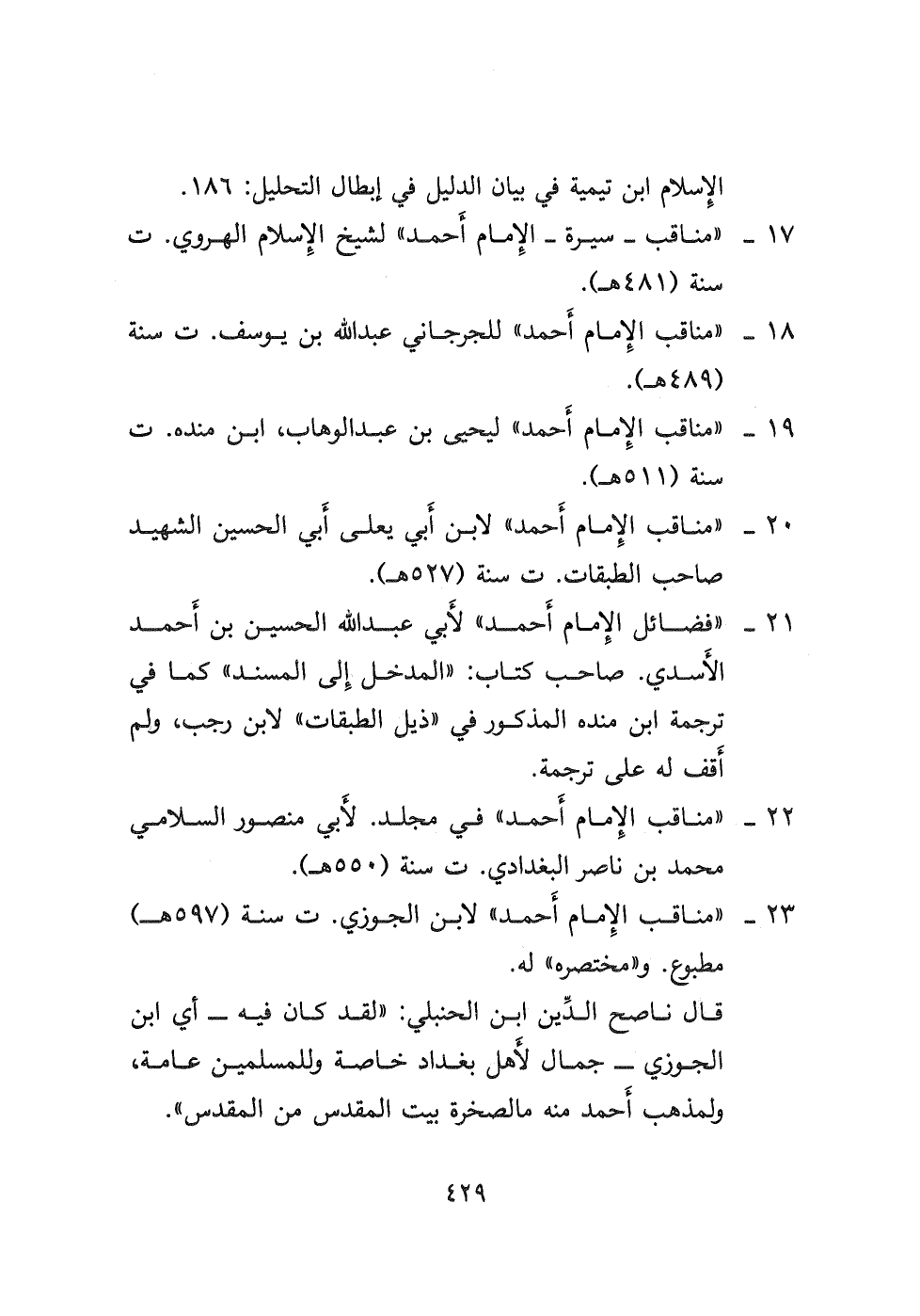 ٢٣- " مناقب الإمام أَحمد " لابن الجوزي ت سنة (٥٩٧ هـ) مطبوع. و " مختصره " له.