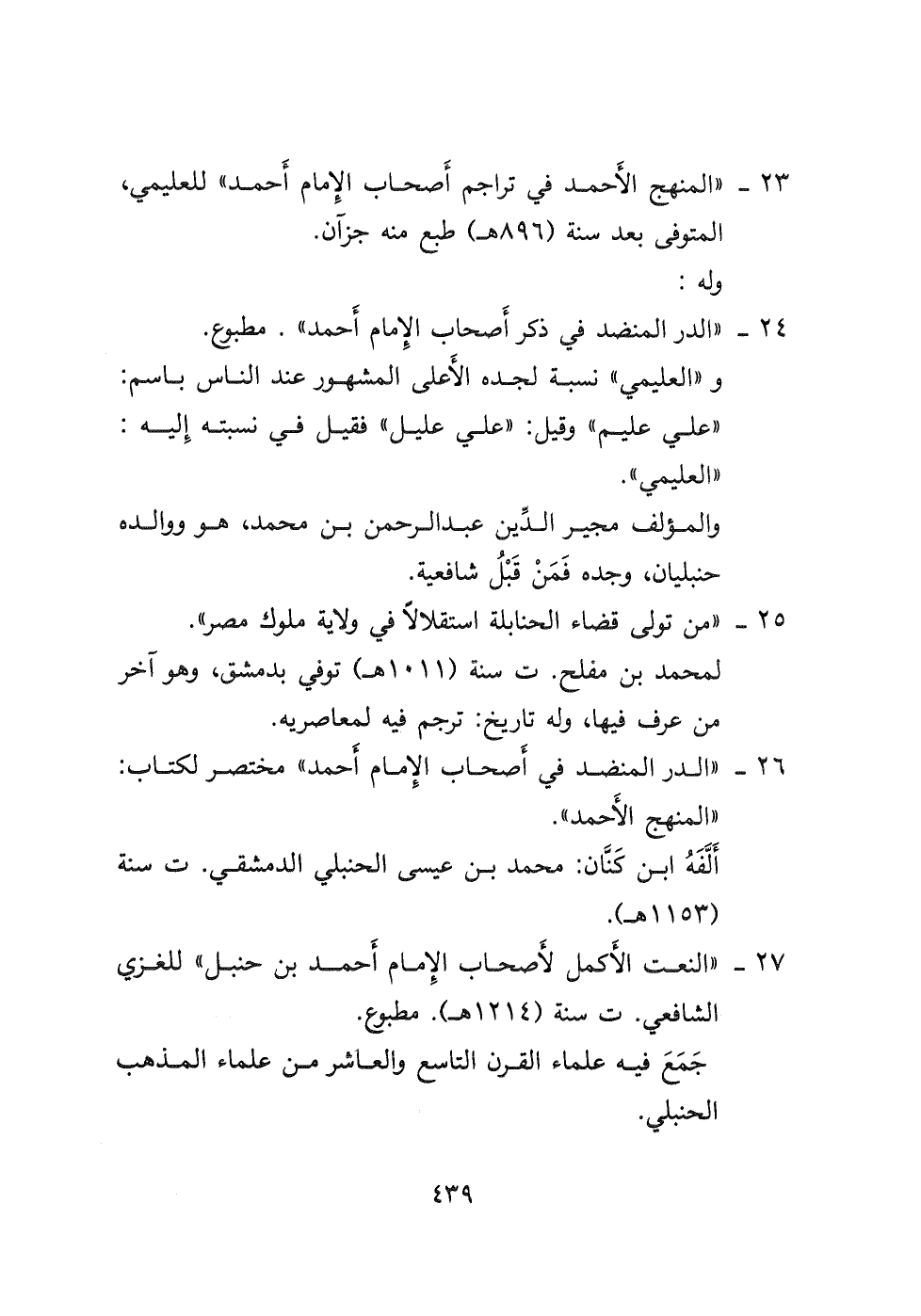 ٢٣- " المنهج الأَحمد في تراجم أَصحاب الإمام أحمد " للعليمي، المتوفى بعد سنة (٨٩٦ هـ) طبع منه جزآن.