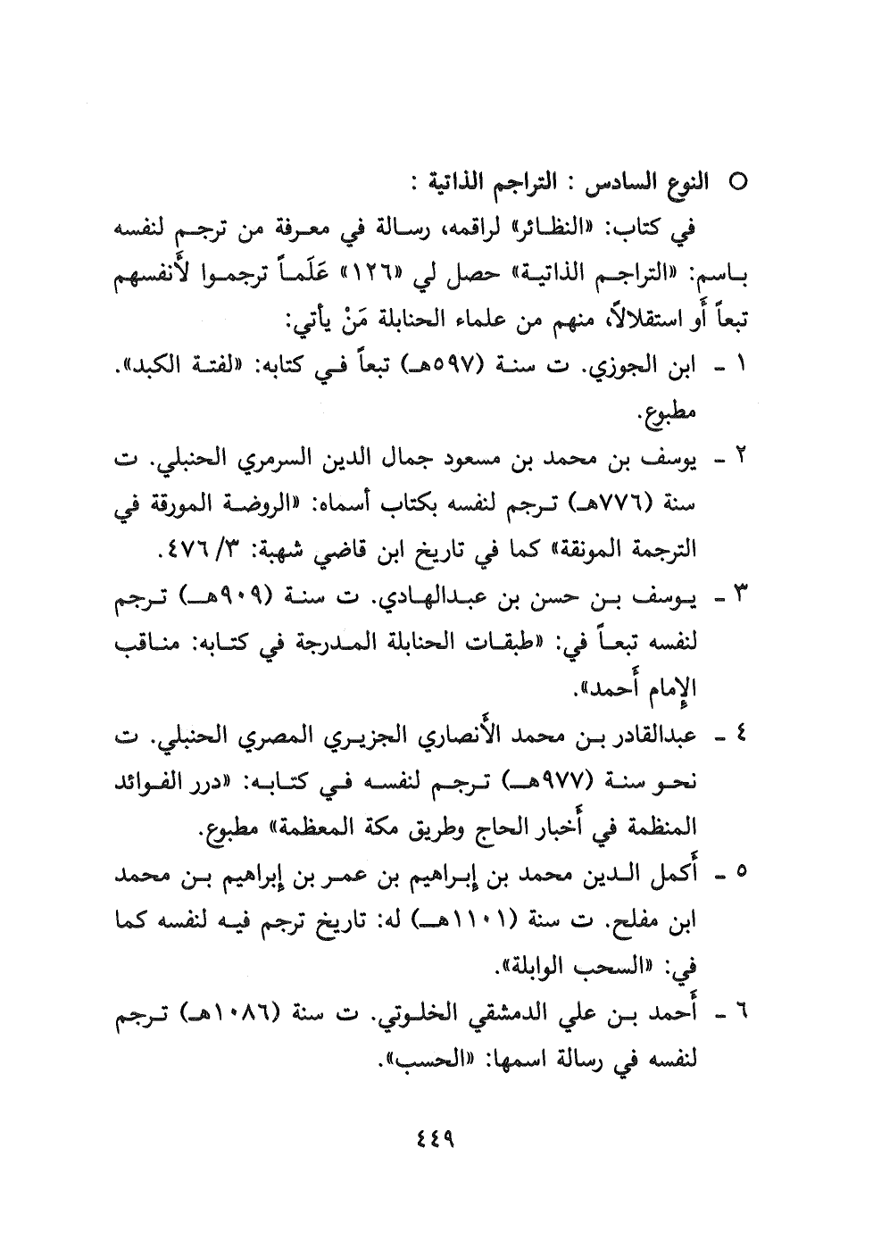 في كتاب: " النظائر " لراقمه، رسالة في معرفة من ترجم لنفسه باسم: " التراجم الذاتية " حصل لي " ١٢٦ " عَلَمًا ترجموا لأنفسهم تبعا أو استقلالًا، منهم من علماء الحنابلة مَنْ يأتي: