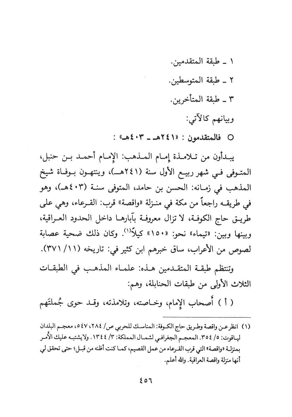 يبدأون من تلامذة إِمام المذهب: الإمام أحمد بن حنبل، المتوفى في شهر ربيع الأول سنة (٢٤١ هـ) ، وينتهون بوفاة شيخ المذهب في زمانه: الحسن بن حامد، المتوفى سنة (٤٠٣ هـ) ، وهو في طريقه راجعا من مكة في منزلة " واقصة " قرب: القرعاء، وهي على طريق حاج الكوفة، لا تزال معروفة بآبارها داخل الحدود العراقية، وبينها وبين: " تيماء " نحو " ١٥٠ " كيلاَ (١) وكان ذلك ضحية عصابة لصوص من الأعراب، ساق خبرهم ابن كثير في: تاريخه (١١/ ٣٧١) .
