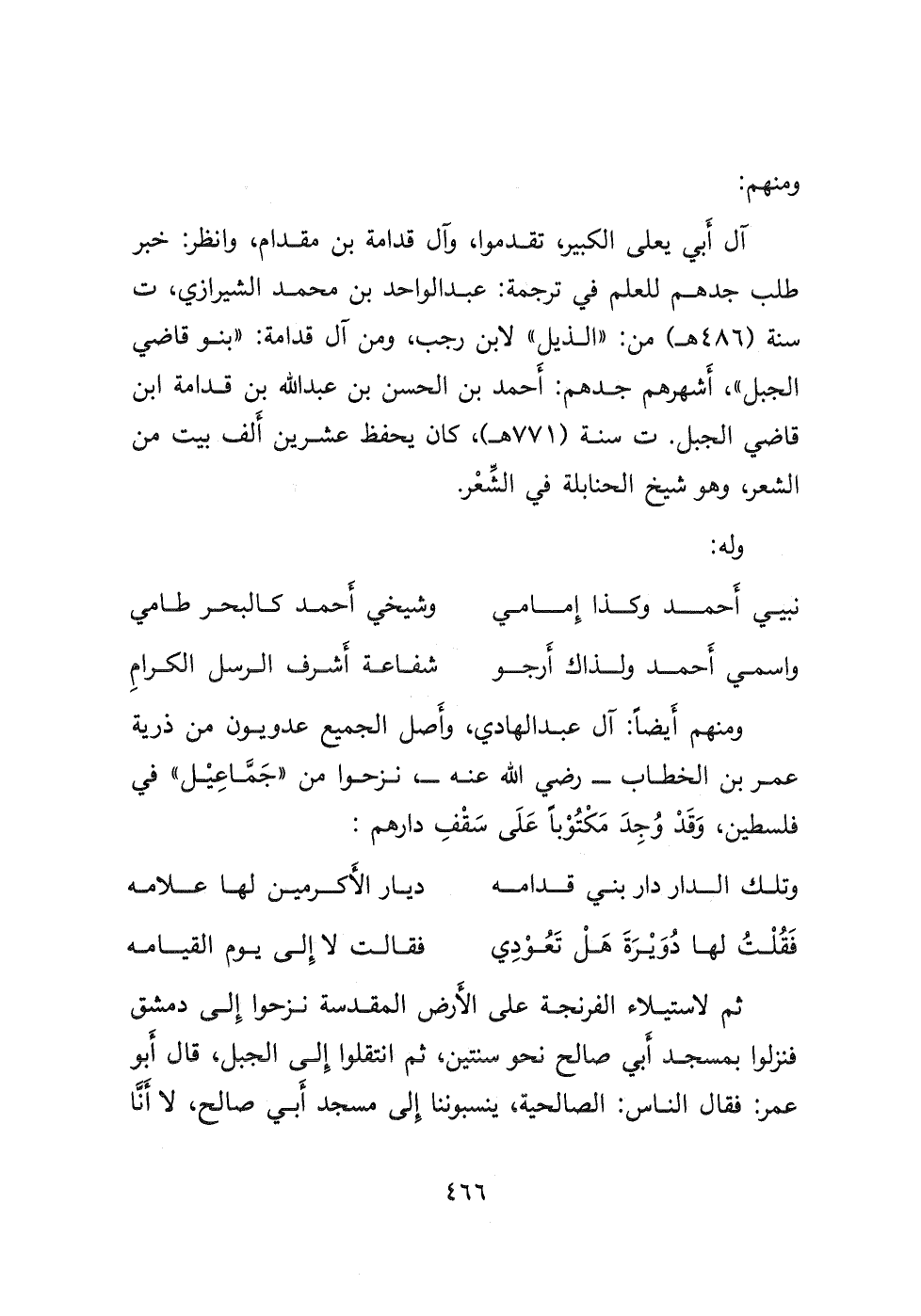 آل أَبي يعلى الكبير تقدموا، وآل قدامة بن مقدام، وانظر خبر طلب جدهم للعلم في ترجمة: عبد الواحد بن محمد الشيرازي، ت سنة (٤٨٦ هـ) من: " الذيل " لابن رجب، ومن آل قدامة: " بنو قاضي الجبل "، أَشهرهم جدهم: أَحمد بن الحسن بن عبد الله بن قدامة ابن قاضي الجبل ت سنة (٧٧١ هـ) ، كان يحفظ عشرين أَلف بيت من الشعر وهو شيخ الحنابلة في الشِّعْر.
