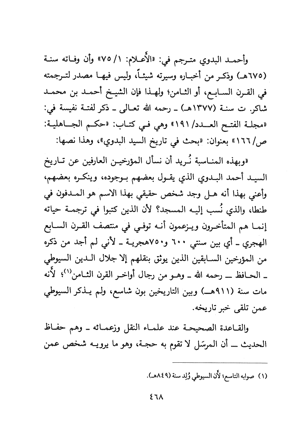 وأحمد البدوي مترجم في: " الأعلام: ١/ ٧٥ " وأن وفاته سنة (٦٧٥ هـ) وذكر من أخباره وسيرته شيئا، وليس فيها مصدر لترجمته في القرن السابع، أو الثامن؛ ولهذا فإن الشيخ أحمد بن محمد شاكر ت سنة (١٣٧٧ هـ) - رحمه الله تعالى- ذكر لفتة نفيسة في: " مجلة الفتح العدد/ ١٩١ " وهي في كتاب: " حكم الجاهلية: ص/ ١٦٦ " بعنوان: " بحث في تاريخ السيد البدوي، وهذا نصها: