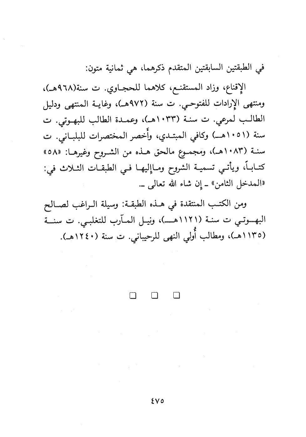 الِإقناع، وزاد المستقنع، كلاهما للحجاوي ت سنة (٩٦٨ هـ) ، ومنتهى الإرادات للفتوحي ت سنة (٩٧٢ هـ) ، وغاية المنتهى ودليل الطالب لمرعي ت سنة (١٠٣٣ هـ) ، وعمدة الطالب للبهوتي ت سنة (١٠٥١ هـ) وكافي المبتدي، وأَخصر المختصرات للبلباني ت سنة (١٠٨٣ هـ) ، ومجموع ما لحق هذه من الشروح وغيرها: " ٥٨ " كتابًا، ويأتي تسمية الشروح وما إليها في الطبقات الثلاث في: " المدخل الثامن " - إِن شاء الله تعالى-.