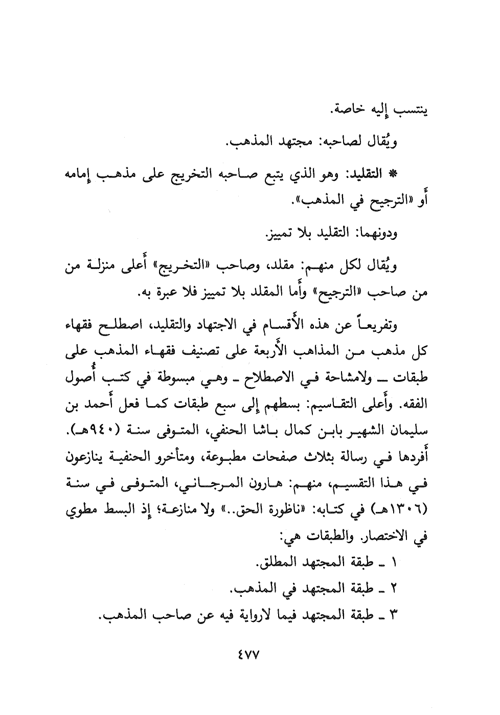 وتفريعاً عن هذه الأقسام في الاجتهاد والتقليد، اصطلح فقهاء كل مذهب من المذاهب الأربعة على تصنيف فقهاء المذهب على طبقات - ولامشاحة في الاصطلاح - وهي مبسوطة في كتب أصول الفقه. وأَعلى التقاسيم: بسطهم إلى سبع طبقات كما فعل أحمد بن سليمان الشهير بابن كمال باشا الحنفي، المتوفى سنة (٩٤٠ هـ) أَفردها في رسالة بثلاث صفحات مطبوعة، ومتأخرو الحنفية ينازعون في هذا التقسيم، منهم: هارون المرجاني، المتوفى في سنة (١٣٠٦ هـ) في كتابه: ناظورة الحق ... " ولا منازعة؛ إذ البسط مطوي في الاختصار والطبقات هي: