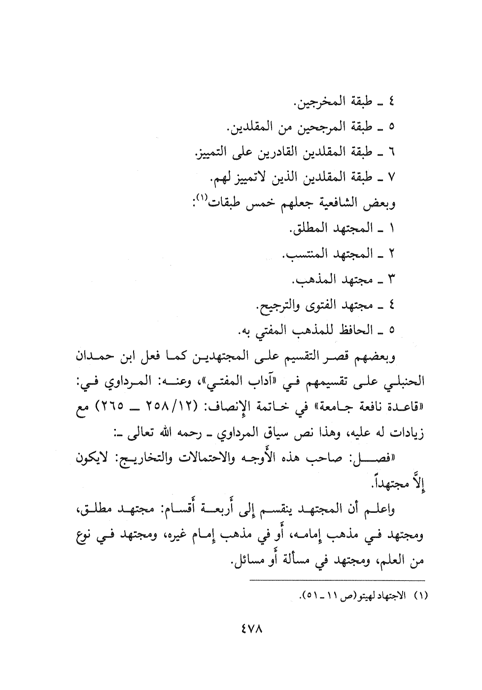 وبعضهم قصر التقسيم على المجتهدين كما فعل ابن حمدان الحنبلي على تقسيمهم في " آداب المفتي "، وعنه: المرداوي في: " قاعدة نافعة جامعة " في خاتمة الِإنصاف: (١٢/٢٥٨- ٢٦٥) مع زيادات له عليه، وهذا نص سياق المرداوي- رحمه الله تعالى-: