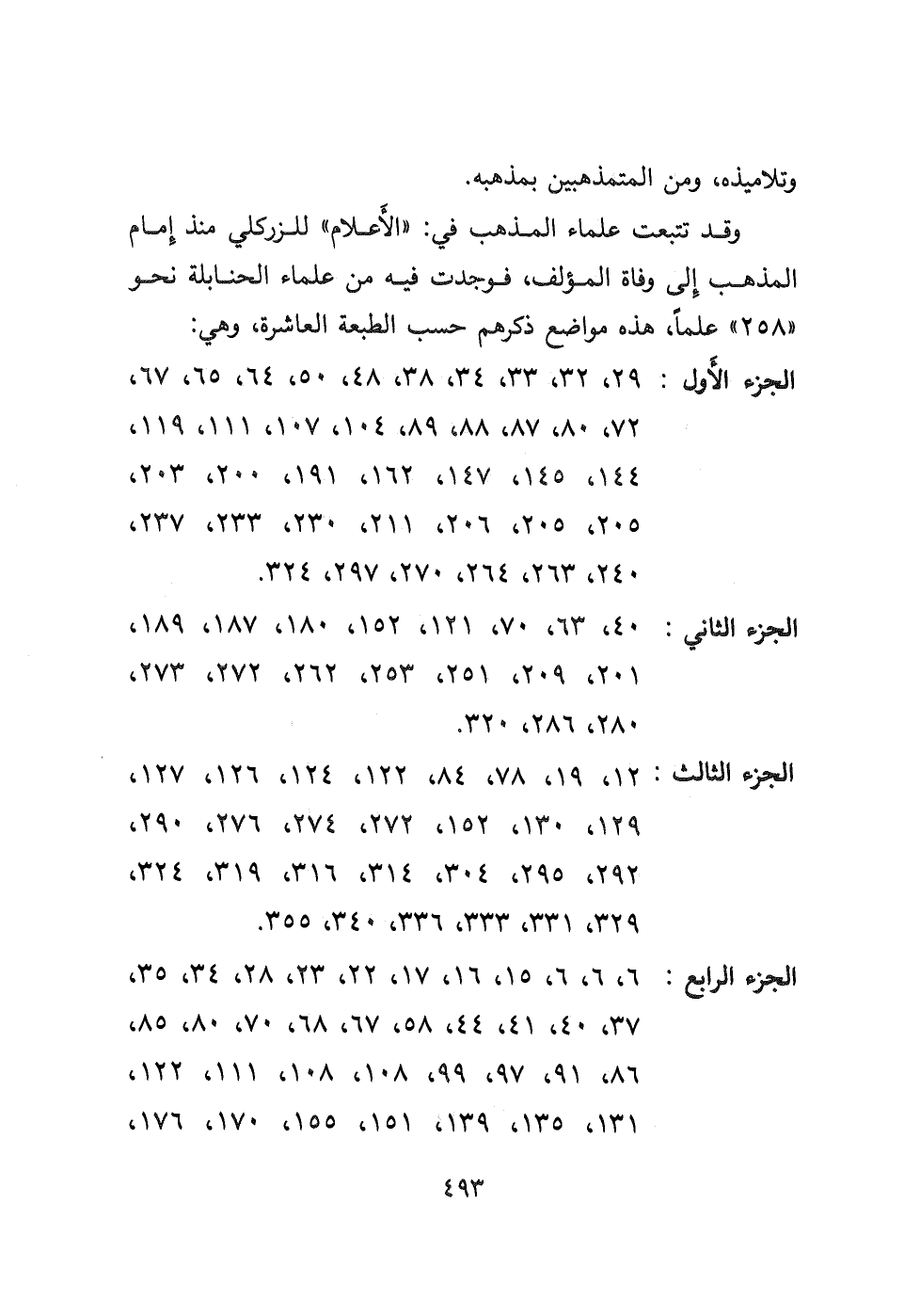 وقد تتبعت علماء المذهب في: " الأعلام " للزركلي منذ إمام المذهب إلى وفاة المؤلف، فوجدت فيه من علماء الحنابلة نحو " ٢٥٨ " علماَ، هذه مواضع ذكرهم حسب الطبعة العاشرة، وهي: