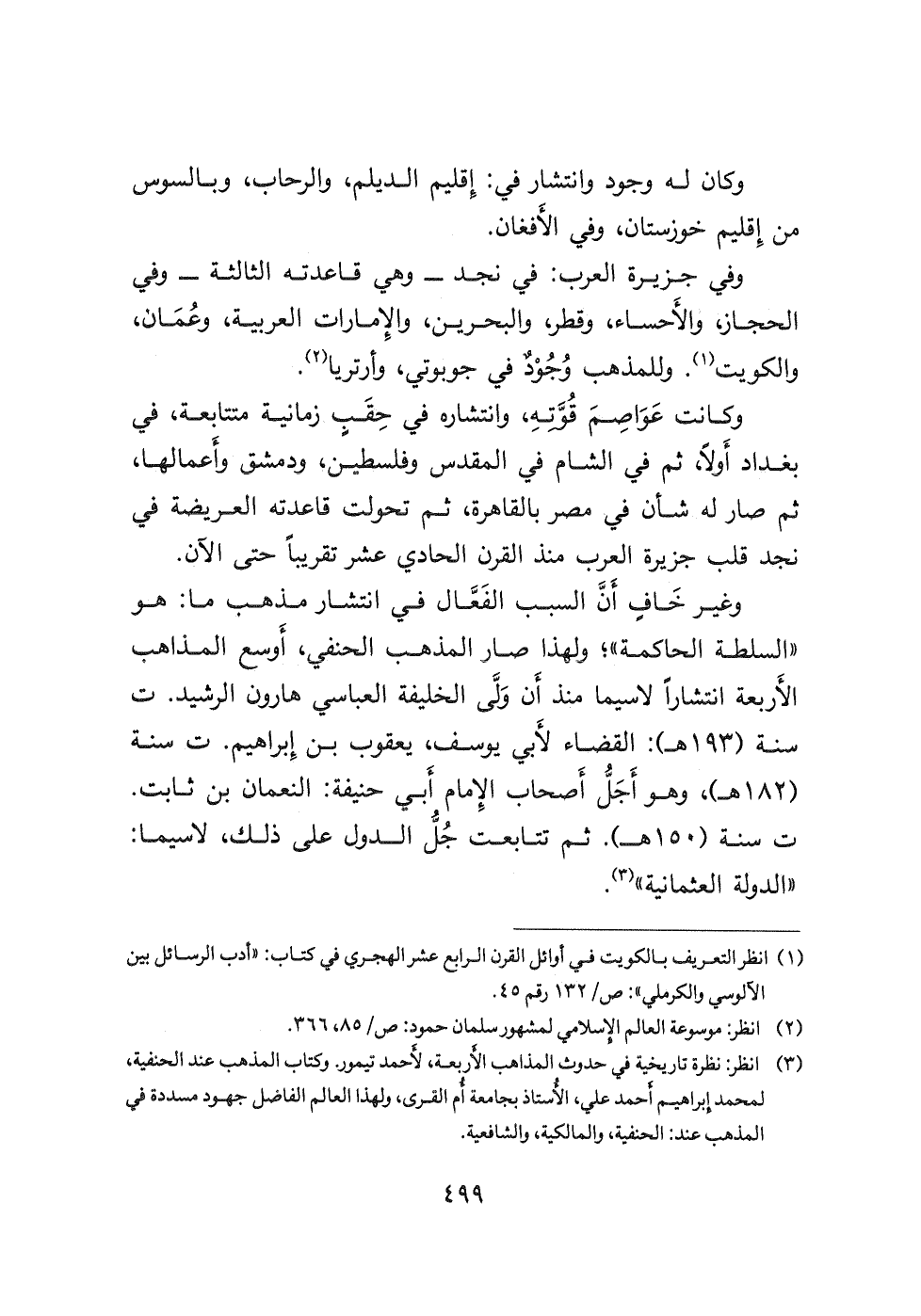وكانت عَوَاصِمَ قُوَّتِهِ، وانتشاره في حِقَبٍ زمانية متتابعة، في بغداد أَولاً، ثم في الشام في المقدس وفلسطين، ودمشق وأَعمالها، ثم صار له شأن في مصر بالقاهرة، ثم تحولت قاعدته العريضة في نجد قلب جزيرة العرب منذ القرن الحادي عشر تقريبًا حتى الآن. وغير خَافٍ أَنَّ السبب الفَعَّال في انتشار مذهب ما: هو " السلطة الحاكمة "؛ ولذا صار المذهب الحنفي، أَوسع المذاهب الأربعة انتشارًا لاسيما منذ أَن وَلَّي الخليفة العباسي هارون الرشيد ت سنة (١٩٣ هـ) : القضاء لأَبي يوسف، يعقوب بن إِبراهيم ت سنة (١٨٢ هـ) ، وهو أَجَلُّ أَصحاب الإمام أَبي حنيفة: النعمان بن ثابت ت سنة (١٥٠ هـ) ، ثم تتابعت جُل الدول على ذلك، لاسيما: " الدولة العثمانية (٣) .