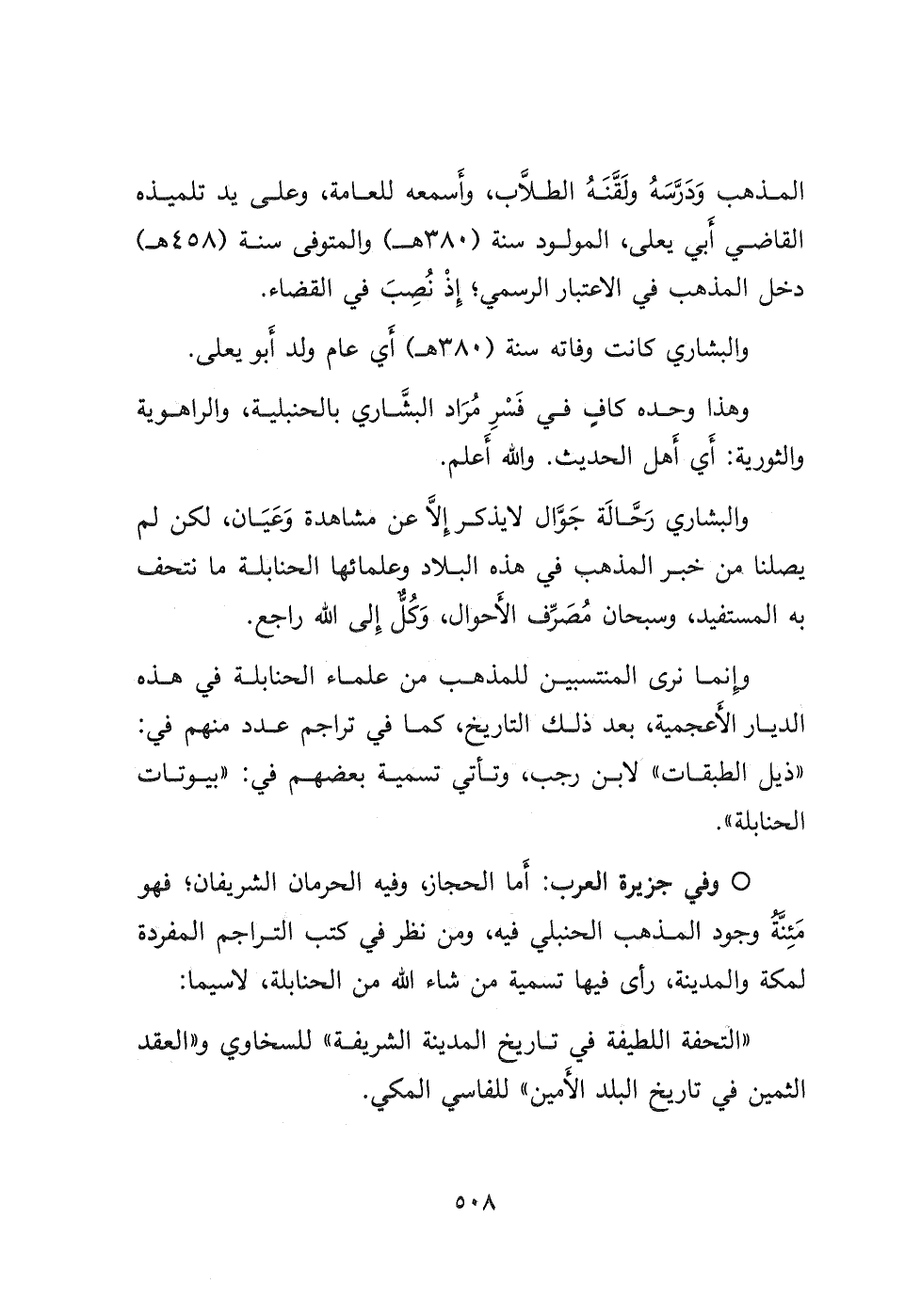 * وفي جزيرة العرب: أما الحجاز وفيه الحرمان الشريفان؛ فهو مَئِنَّةُ وجود المذهب الحنبلي فيه، ومن نظر في كتب التراجم المفردة لمكة والمدينة، رأى فيها تسمية من شاء الله من الحنابلة، لاسيما: " التحفة اللطيفة في تاريخ المدينة الشريفة " للسخاوي و " العقد الثمين في تاريخ البلد الأمين " للفاسي المكي