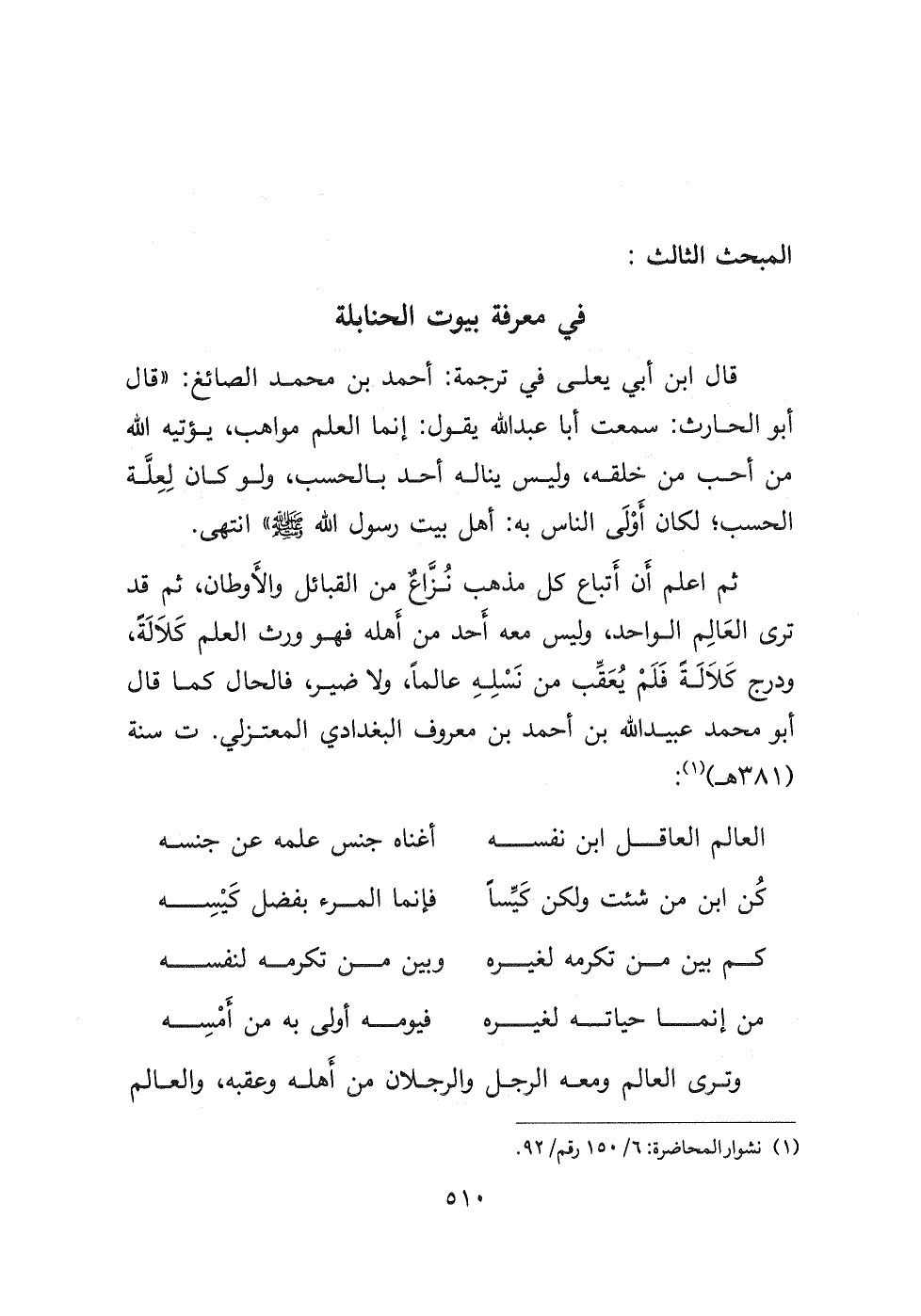 ثم اعلم أَن أَتباع كل مذهب نُزَّاغ من القبائل والأَوطان، ثم قد ترى العَالِم الواحد، وليس معه أَحد من أَهله فهو ورث العلم كَلاَلَةً، ودرج كلالَةً فَلَمْ يُعَقَب من نَسْلِهِ عالماً، ولا ضير فالحال كما قال أبو محمد عبيد الله بن أحمد بن معروف البغدادي المعتزلي ت سنة (٣٨١ هـ) (١) :
