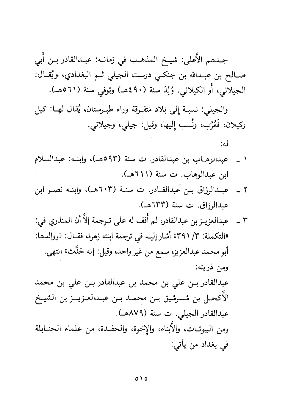 جدهم الأَعلى: شيخ المذهب في زمانه: عبد القادر بن أَبي صالح بن عبد الله بن جنكي دوست الجيلي ثم البغدادي، ويُقال: الجيلاني، أو الكيلاني. وُلدَ سنة (٤٩٠ هـ) وتوفي سنة (٥٦١ هـ) . والجيلي: نسبة إلى بلاد متفرقة وراء طبرستان، يُقال لها: كيل وكيلان، فَعُرِّب، ونُسب إليها، وقيل: جيلي، وجيلاني.