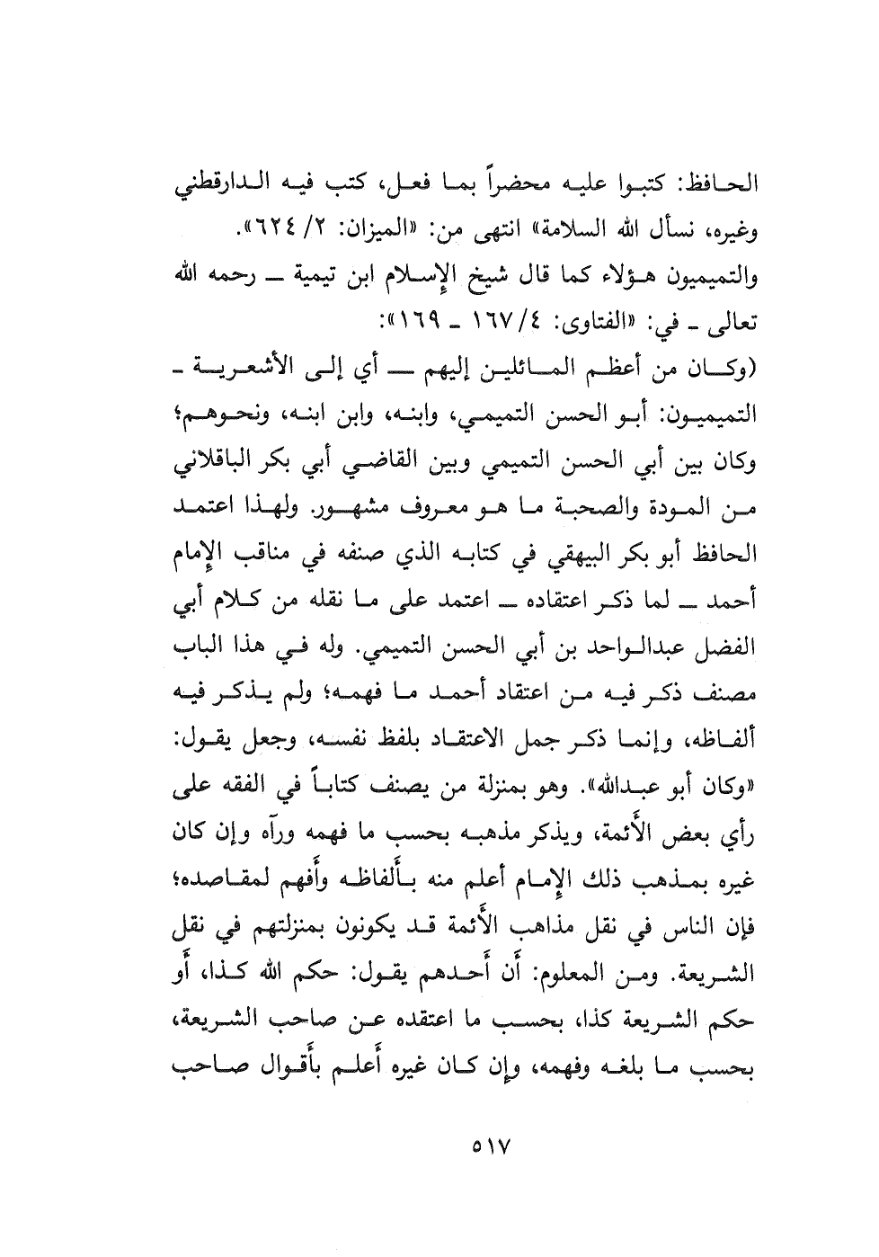 (وكان من أعظم المائلين إليهم - أي إلى الأشعرية- التميميون: أبو الحسن التميمي، وابنه، وابن ابنه، ونحوهم؛ وكان بين أبي الحسن التميمي وبين القاضي أبي بكر الباقلاني من المودة والصحبة ما هو معروف مشهور ولهذا اعتمد الحافظ أبو بكر البيهقي في كتابه الذي صنفه في مناقب الإمام أحمد - لما ذكر اعتقاده - اعتمد على ما نقله من كلام أبي الفضل عبد الواحد بن أبي الحسن التميمي. وله في هذا الباب مصنف ذكر فيه من اعتقاد أحمد ما فهمه؛ ولم يذكر فيه ألفاظه، وإنما ذكر جمل الاعتقاد بلفظ نفسه، وجعل يقول: " وكان أبو عبد الله " وهو بمنزلة من يصنف كتاباً في الفقه على رأي بعض الأَئمة، ويذكر مذهبه بحسب ما فهمه ورآه وإن كان غيره بمذهب ذلك الإمام أعلم منه بأَلفاظه وأَفهم لمقاصده فإن الناس في نقل مذاهب الأَئمة قد يكونون بمنزلتهم في نقل الشريعة. ومن المعلوم: أن أحدهم يقول: حكم الله كذا، أو حكم الشريعة كذا، بحسب ما اعتقده عن صاحب الشريعة، بحسب ما بلغه وفهمه، وإن كان غيره أعلم بأقوال صاحب