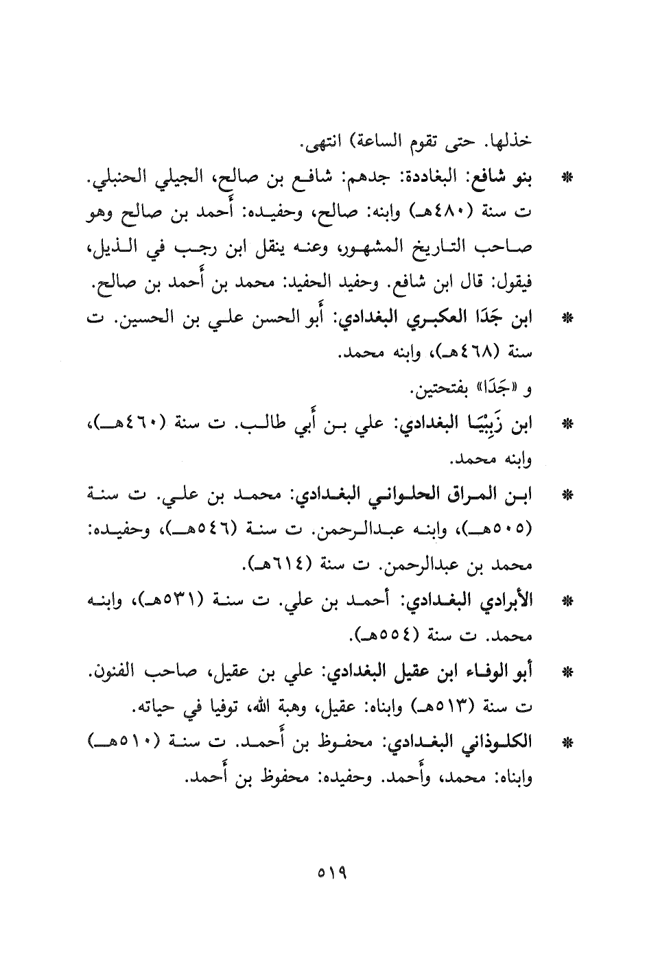 - الكلوذاني البغدادي: محفوظ بن أحمد ت سنة (٥١٠ هـ) وابناه: محمد، وأحمد وحفيده: محفوظ بن أحمد.