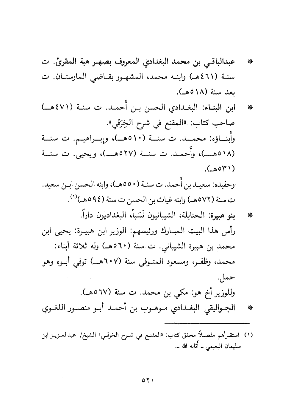 - ابن البناء: البغدادي الحسن بن أَحمد ت سنة (٤٧١ هـ) صاحب كتاب: المقنع في شرح الخِرَقي ".
