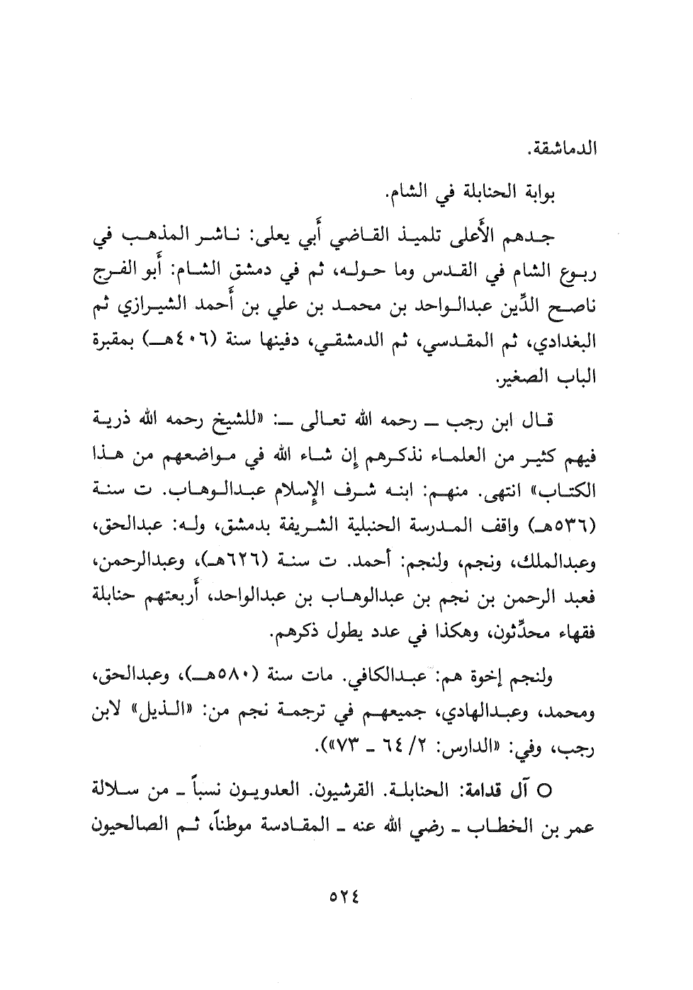 - آل قدامة: الحنابلة. القرشيون. العدويون نسبًا- من سلالة عمر بن الخطاب- رضي الله عنه- المقادسة موطناً، ثم الصالحيون