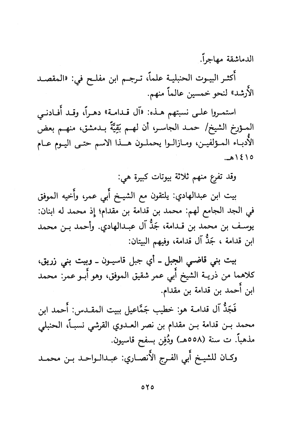 بيت ابن عبد الهادي: يلتقون مع الشيخ أبي عمر، وأخيه الموفق في الجد الجامع لهم: محمد بن قدامة بن مقدام؛ إذ محمد له ابنان: يوسف بن محمد بن قدامة، جَدُّ آل عبد الهادي. وأحمد بن محمد ابن قدامة، جَدُّ آل قدامة، وفيهم البيتان: