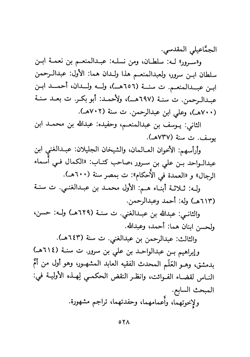وأرأسهم: الأخوان العالمان، والشيخان الجليلان: عبد الغني ابن عبد الواحد بن علي بن سرور، صاحب كتاب: " الكمال في أسماء الرجال " و " العمدة في الأَحكام " ت بمصر سنة (٦٠٠ هـ) .