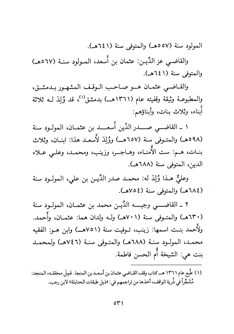(١) طُبع عام ١٣٦١ هـ كتاب وقف القاضي عثمان بن أسعد بن المنجا عَمِلَ محققه، المنجد: مُشَجَّرًا في ذُرية الواقف، أخذها من تراجمهم في: " ذيل طبقات الحنابلة لابن رجب.