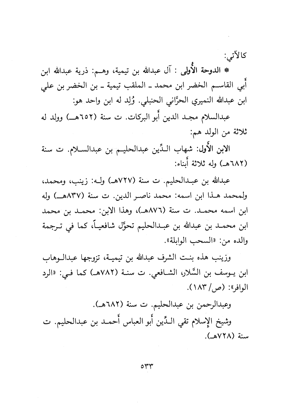 - الدوحة الأولى: آل عبد الله بن تيمية، وهم: ذرية عبد الله ابن أَبي القاسم الخضر ابن محمد- الملقب تيمية- بن الخضر بن علي ابن عبد الله النميري الحرَّاني الحنبلي وُلد له ابن واحد هو: عبد السلام مجد الدين أَبو البركات ت سنة (٦٥٢ هـ) وولد له