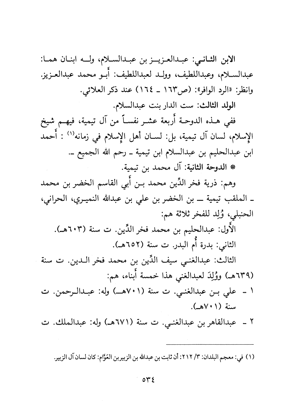 الابن الثاني: عبد العزيز بن عبد السلام، وله ابنان هما: عبد السلام، وعبد اللطيف، وولد لعبد اللطيف: أبو محمد عبد العزير وانظر " الرد الوافر: (ص ١٦٣- ١٦٤) عند ذكر العلائي.