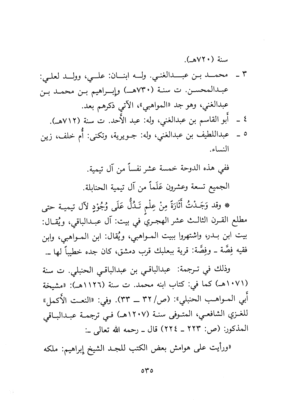 - وقد وَجَدْتُ أَثَارَةً مِنْ عِلْم تَدُلّ على وجوْدٍ لآل تيمية حتى مطلع القرن الثالث عشر الهجري في بيت: آل عبد الباقي، ويُقال: بيت ابن بدر واشتهروا ببيت المواهبي، ويُقال: ابن المواهبي، وابن فقيه فِصَّة- وفِصَّة: قرية ببعلبك قرب دمشق، كان جده خطيباً لها-، وذلك في ترجمة: عبد الباقي بن عبد الباقي الحنبلي ت سنة (١٠٧١ هـ) كما في: كتاب ابنه محمد ت سنة (١١٢٦ هـ) : " مشيخة أَبي المواهب الحنبلي ": (ص/ ٣٢- ٣٣) . وفي: " النعت الأَكمل " للغزي الشافعي، المتوفى سنة (١٢٠٧ اهـ) في ترجمة عبد الباقي المذكور (ص: ٢٢٣- ٢٢٤) قال- رحمه الله تعالى-: