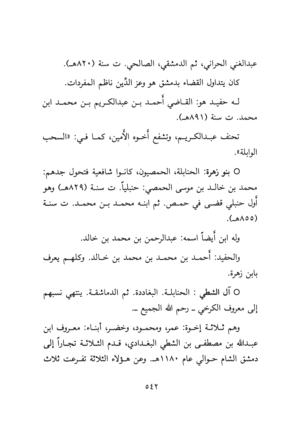 - بنو زهرة: الحنابلة، الحمصيون، كانوا شافعية فتحول جدهم: محمد بن خالد بن موسى الحمصي: حنبلياً ت سنة (٨٢٩ هـ) . وهو أَول حنبلي قضى في حمص ثم ابنه محمد بن محمد ت سنة (٨٥٥ هـ) .