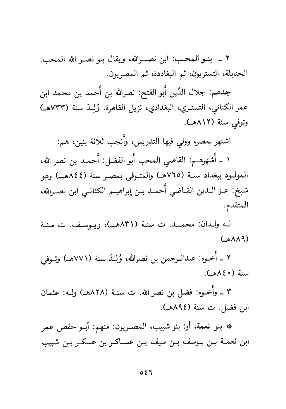 ٢- بنو المحب: ابن نصر الله، ويقال بنو نصر الله المحب: الحنابلة، التستريون، ثم البغاددة، ثم المصريون.