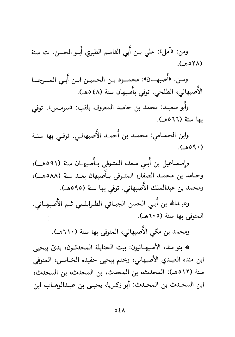 ومن: " أصبهان ": محمود بن الحسين ابن أبي المرجا الأصبهاني، الطلحي توفي بأَصبهان سنة (٥٤٨ هـ) .