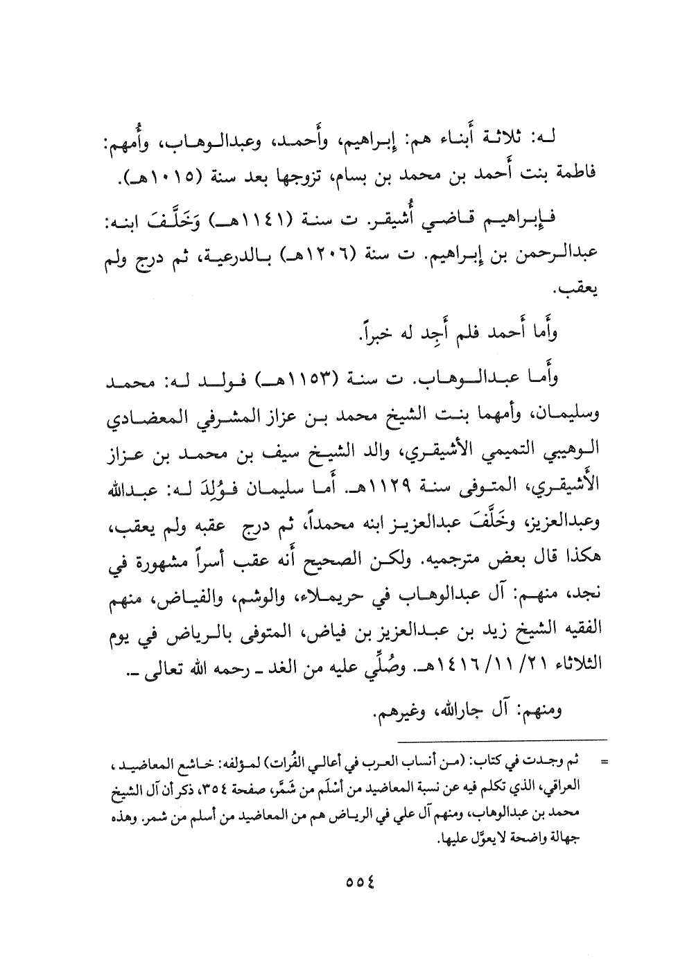 = ثم وجدت في كتاب: (من أنساب العرب في أعالي الفُرات) لمؤلفه: خاشع المعاضيد، العراقي، الذي تكلم فيه عن نسبة المعاضيد من أسلَم من شَمر صفحة ٣٥٤، ذكر أن آل الشيخ محمد بن عبد الوهاب، ومنهم آل علي في الرياض هم من المعاضيد من أسلم من شمر وهذه جهالة واضحة لا يعول عليها.