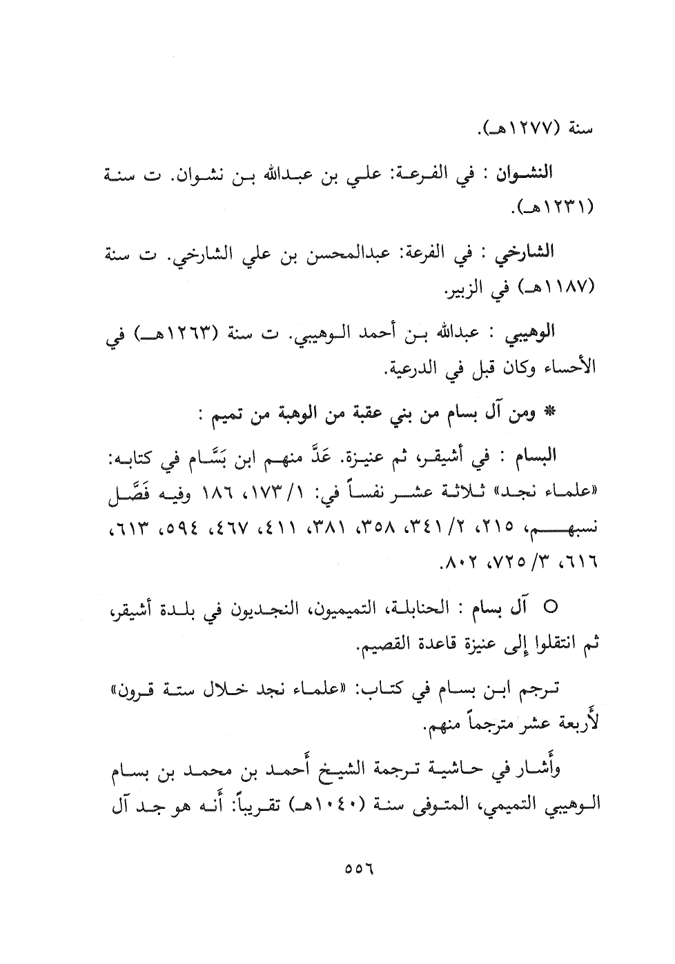 البسام: في أشيقر، ثم عنيزة عَدَّ منهم ابن بَسَّام في كتابه: " علماء نجد " ثلاثة عشر نفسًا في:١/١٧٣، ١٨٦ وفيه فَصَّل نسبهم، ٢١٥، ٢/ ٣٤١، ٣٥٨،٣٨١،٤١١، ٤٦٧، ٥٩٤،٦١٣، ٦١٦، ٣/٧٢٥، ٨٠٢.