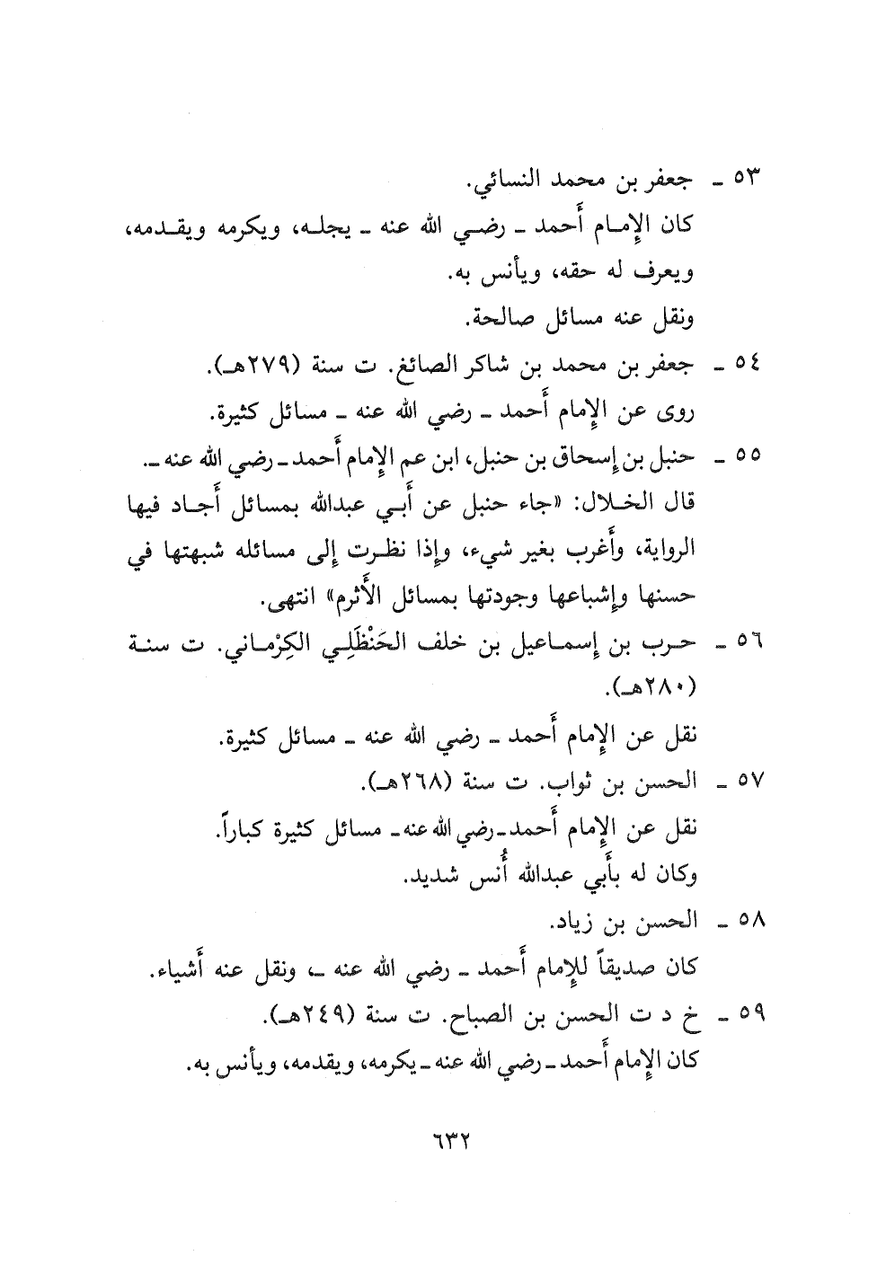 ٥٥- حنبل بن إسحاق بن حنبل، ابن عم الإمام أحمد - رضي الله عنه -. قال الخلال: " جاء حنبل عن أبي عبد الله بمسائل أجاد فيها الرواية، وأغرب بغير شيء، وإذا نظرت إلى مسائله شبهتها في حسنها وإشباعها وجودتها بمسائل الأثر " انتهى.