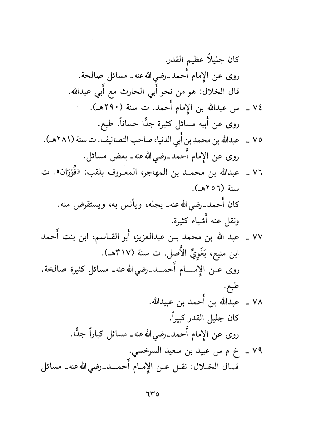 ٧٥- عبد الله بن محمد بن أبي الدنيا، صاحب التصانيف ت سنة (٢٨١ هـ) . روى عن الإمام أحمد- رضي الله عنه- بعض مسائل.