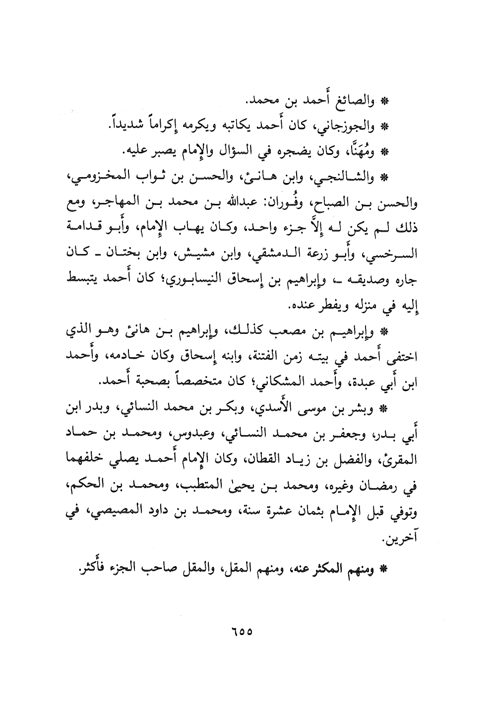 - والشَّالنجي، وابن هانئ، والحسن بن ثواب المخزومي، والحسن بن الصباح، وفوران: عبد الله بن محمد بن المهاجر ومع ذلك لم يكن له إلا جزء واحد، وكان يهاب الإمام، وأبو قدامة السرخسي، وأبو زرعة الدمشقي، وابن مشيش، وابن بختان- كان جاره وصديقه-، وإبراهيم بن إسحاق النيسابوري؛ كان أحمد يتبسط إليه في منزله ويفطر عنده.