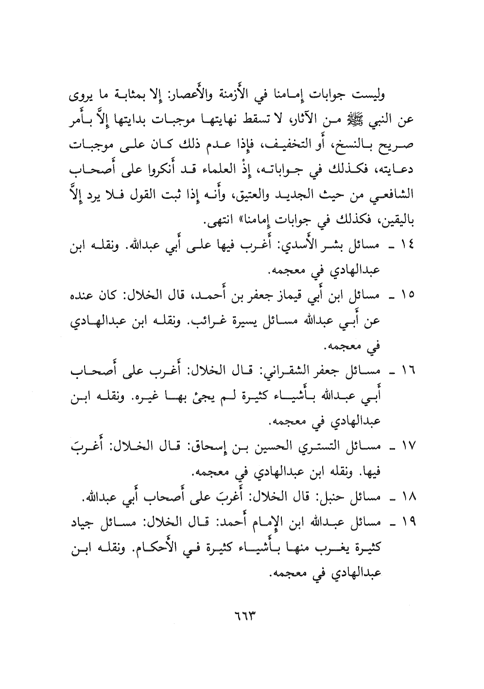 ١٩- مسائل عبد الله ابن الإمام أحمد: قال الخلال: مسائل جياد كثيرة يغرب منها بأشياء كثيرة في الأحكام. ونقله ابن اعبد الهادي في معجمه.