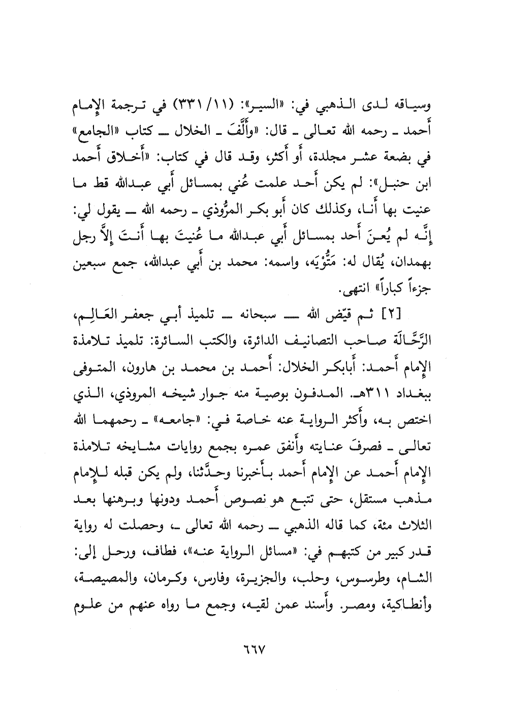 وسياقه لدى الذهبي في: " السير ": (١١/ ٣٣١) في ترجمة الإمام أحمد- رحمه الله تعالى- قال: " وألف- الخلال- كتاب " الجامع " في بضعة عشر مجلدة، أو أكثر وقد قال في كتاب: " أخلاق أحمد ابن حنبل ": لم يكن أحد علمت غني بمسائل أبي عبد الله قط ما عنيت بها أنا، وكذلك كان أبو بكر المرُّوذي- رحمه الله- يقول لي: إنه لم يُعنَ أحد بمسائل أبي عبد الله ما عُنيت بها أنت إلا رجل بهمدان، يقال له: مَتُّوْيَه، واسمه: محمد بن أبي عبد الله، جمع سبعين جزءا كبارا " انتهى.