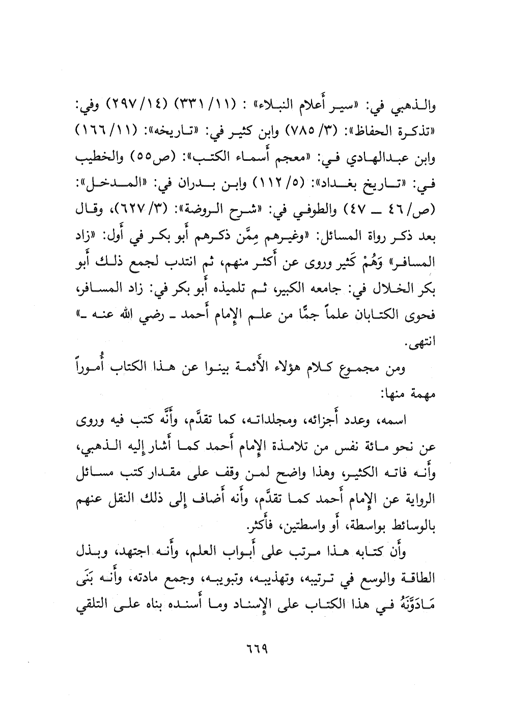 والذهبي في " سير أعلام النبلاء ": (١١/ ٣٣١) (١٤/٢٩٧) وفي: " تذكرة الحفاظ ": (٣/ ٧٨٥) وابن كثير في: " تاريخه ": (١١/ ١٦٦) وابن عبد الهادي في: " معجم أسماء الكتب ": (ص ٥٥) والخطيب في: " تاريخ بغداد ": (٥/ ١١٢) وابن بدران في: " المدخل ": (ص/٤٦- ٤٧) والطوفي في: " شرح الروضة ": (٣/٦٢٧) ، وقال بعد ذكر رواة المسائل: " وغيرهم ممن ذكرهم أبو بكر في أول: " زاد المسافر وهم كثير وروى عن أكثر منهم، ثم انتدب لجمع ذلك أبو بكر الخلال في: جامعه الكبير ثم تلميذه أبو بكر في: زاد المسافر فحوى الكتابان علماً جما من علم الإمام أحمد- رضي الله عنه- " انتهى.
