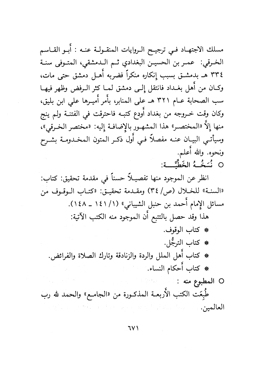 مسلك الاجتهاد في ترجيح الروايات المنقولة عنه: أبو القاسم الخرقي: عمر بن الحسين البغدادي ثم الدمشقي، المتوفى سنة ٣٣٤ هـ بدمشق بسبب إنكاره منكراً فضربه أهل دمشق حتى مات، وكان من أهل بغداد فانتقل إلى دمشق لما كثر الرفض وظهر فيها سب الصحابة عام ٣٢١ هـ على المنابر بأمر أميرها علي ابن بليق، وكان وقت خروجه من بغداد أودع كتبه فاحترقت في الفتنة ولم ينج منها إلا " المختصر " هذا المشهور بالإضافة إليه: " مختصر الخرقي "، وسيأتي البيان عنه مفصلا في أول ذكر المتون المخدومة بشرح ونحوه. والله أعلم.