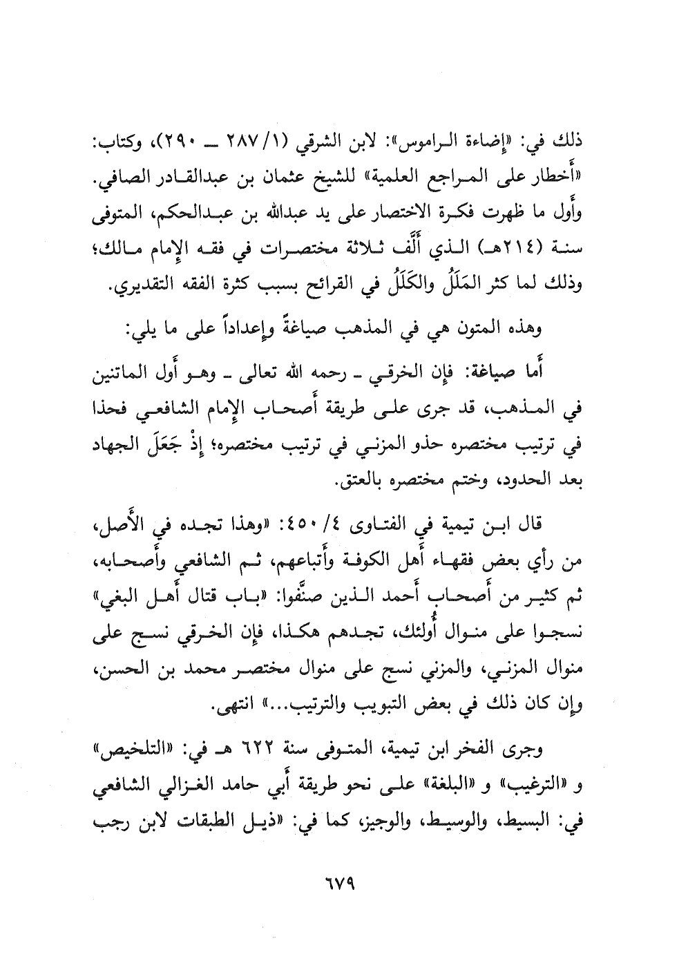 وجرى الفخر ابن تيمية، المتوفى سنة ٦٢٢ هـ في: " التلخيص " و " الترغيب " و " البلغة " على نحو طريقة أبي حامد الغزالي الشافعي في: البسيط، والوسيط، والوجيز كما في: " ذيل الطبقات لابن رجب