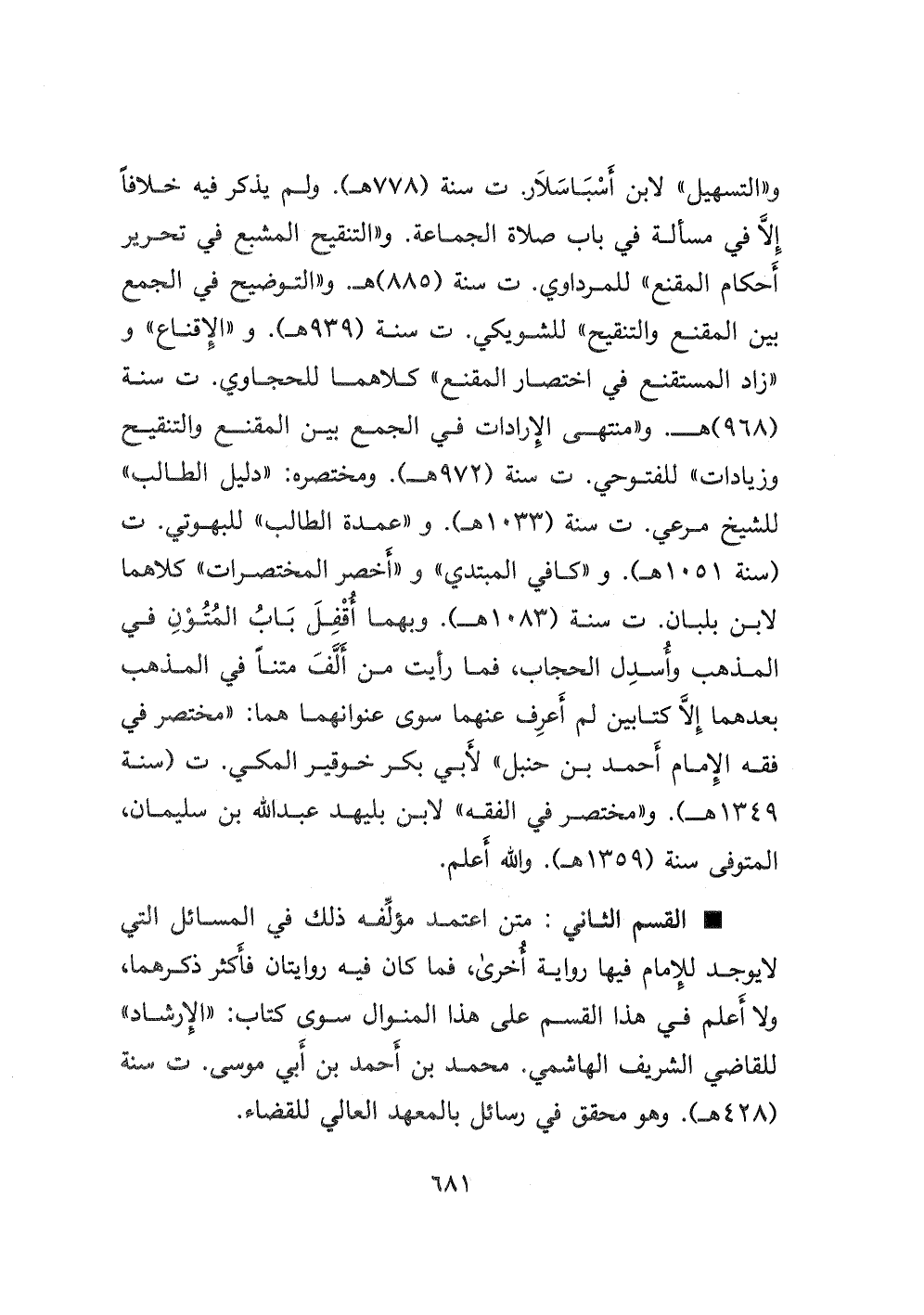 و " التسهيل " لابن أَسْبَاسَلار ت سنة (٧٧٨ هـ) . ولم يذكر فيه خلافاً إلا في مسألة في باب صلاة الجماعة. و " التنقيح المشبع في تحرير أحكام المقنع " للمرداوي ت سنة (٨٨٥) هـ. و " التوضيح في الجمع بين المقنع والتنقيح " للشويكي ت سنة (٩٣٩ هـ) . و " الإقناع " و " زاد المستقنع في اختصار المقنع " كلاهما للحجاوي ت سنة (٩٦٨) هـ. و " منتهى الإرادات في الجمع بين المقنع والتنقيح وزيادات " للفتوحي ت سنة (٩٧٢) . ومختصره: " دليل الطالب " للشيخ مرعي ت سنة (١٠٣٣ هـ) . و " عمدة الطالب " للبهوتي ت (سنة ١٠٥١ هـ) . و " كافي المبتدي " و " أخصر المختصرات " كلاهما لابن بلبان ت سنة (١٠٨٣ هـ) . وبهما أقفل باب المتون في المذهب وأسدل الحجاب، فما رأيت من ألف متنا في المذهب بعدهما إلا كتابين لم أعرف عنهما سوى عنوانهما هما: " مختصر في فقه الإمام أحمد بن حنبل " لأبي بكر خوقير المكي ت (سنة ١٣٤٩ هـ) . و " مختصر في الفقه " لابن بليهد عبد الله بن سليمان، المتوفى سنة (١٣٥٩ هـ) . والله أعلم.