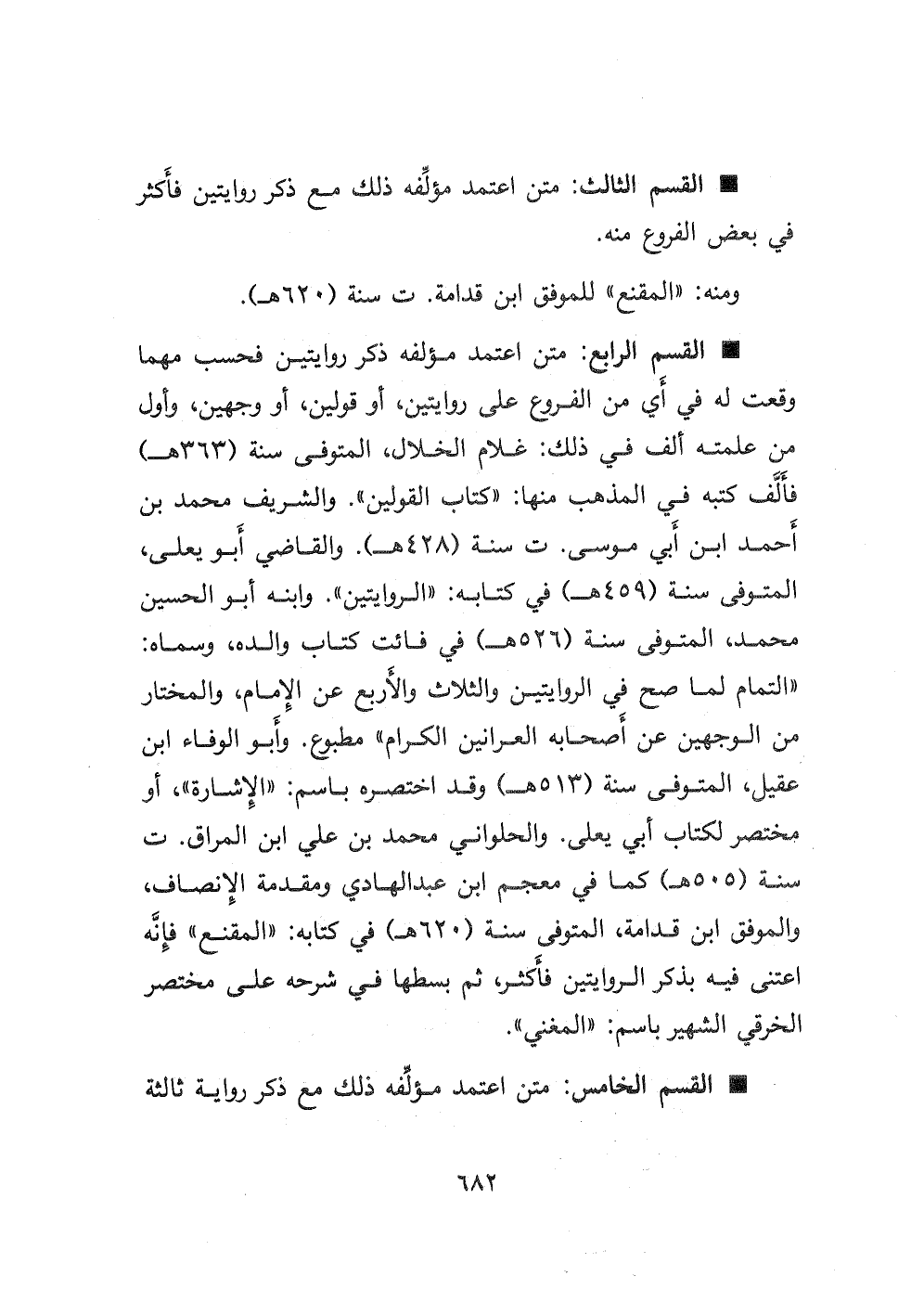 - القسم الرابع: متن اعتمد مؤلفه ذكر روايتين فحسب مهما وقعت له في أي من الفروع على روايتين، أو قولين، أو وجهين، وأول من علمته ألف في ذلك: غلام الخلال، المتوفى سنة (٣٦٣ هـ) فألف كتبه في المذهب منها: كتاب القولين ". والشريف محمد بن أحمد ابن أبي موسى ت سنة (٤٢٨ هـ) . والقاضي أبو يعلى، المتوفى سنة (٤٥٩ هـ) في كتابه: " الروايتين ". وابنه أبو الحسين محمد، المتوفى سنة (٥٢٦ هـ) في فائت كتاب والده، وسماه: " التمام لما صح في الروايتين والثلاث والأربع عن الإمام، والمختار من الوجهين عن أصحابه العرانين الكرام " مطبوع. وأبو الوفاء ابن عقيل، المتوفى سنة (٥١٣ هـ) وقد اختصره باسم: " الإشارة "، أو مختصر لكتاب أبي يعلى. والحلواني محمد بن علي ابن المراق ت سنة (٥٠٥ هـ) كما في معجم ابن عبد الهادي ومقدمة الإنصاف، والموفق ابن قدامة، المتوفى سنة (٦٢٠ هـ) في كتابه: " المقنع " فإنه اعتنى فيه بذكر الروايتين فأكثر ثم بسطها في شرحه على مختصر الخرقي الشهير باسم: " المغني ".