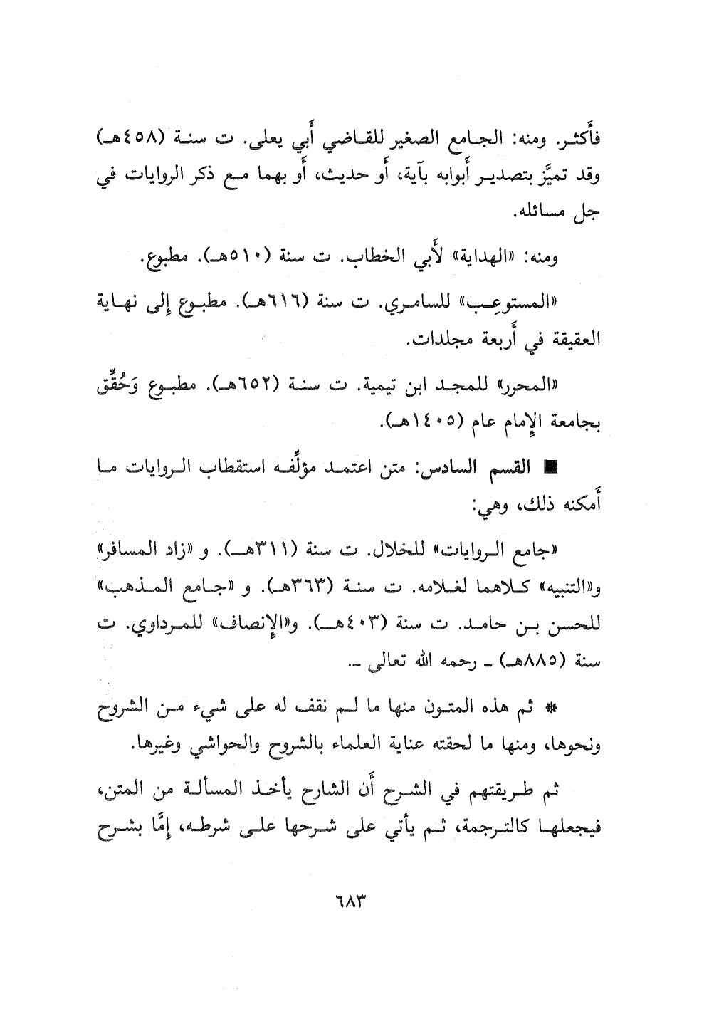 و" التنبيه " كلاهما لغلامه ت سنة (٣٦٣ هـ) . و " جامع المذهب " للحسن بن حامد ت سنة (٤٠٣ هـ) . و " الإنصاف " للمرداوي ت سنة (٨٨٥ هـ) - رحمه الله تعالى-.