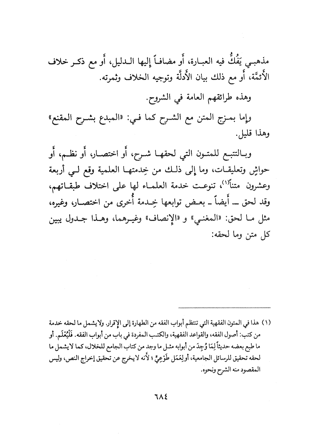 (١) هذا في المتون الفقهية التي تنتظم أبواب الفقه من الطهارة إلى الإقرار ولا يشمل ما لحقه خدمة من كتب: أصول الففه، والقواعد الفقهية، والكتب المفردة في باب من أبواب الفقه. فليعلم. أو ما طبع بعضه حديثا لما وجد من أبوابه مثل ما وجد من كتاب الجامع للخلال، كما لا يشمل ما لحقه تحقيق للرسائل الجامعية، أو لعمل طوعي لأنه لا يخرج عن تحقيق إخراج النص، وليس المقصود منه الشرح ونحوه.